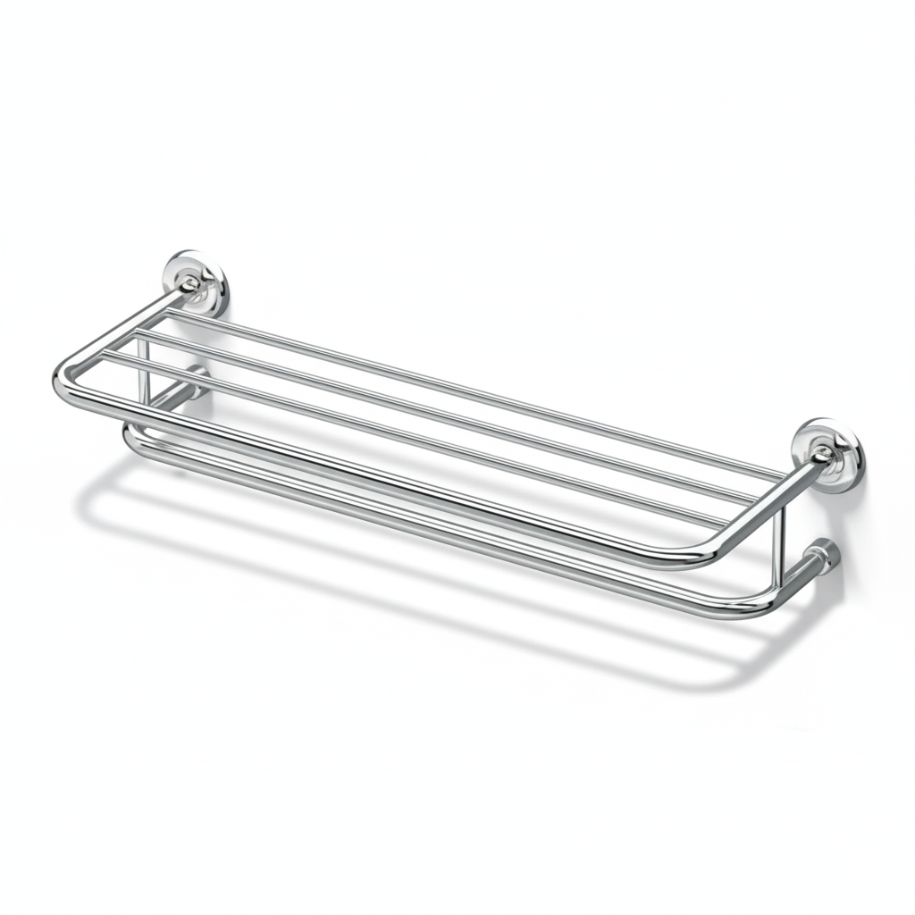 - جودة فائقة ومقاومة للرطوبة: مصنوع من معدن قوي (عادةً ستانلس ستيل أو نحاس) ومغطى بطبقة نهائية من الكروم اللامع، مما يمنحه مظهراً لامعاً ويضمن مقاومة كاملة للصدأ والتآكل في البيئات الرطبة.